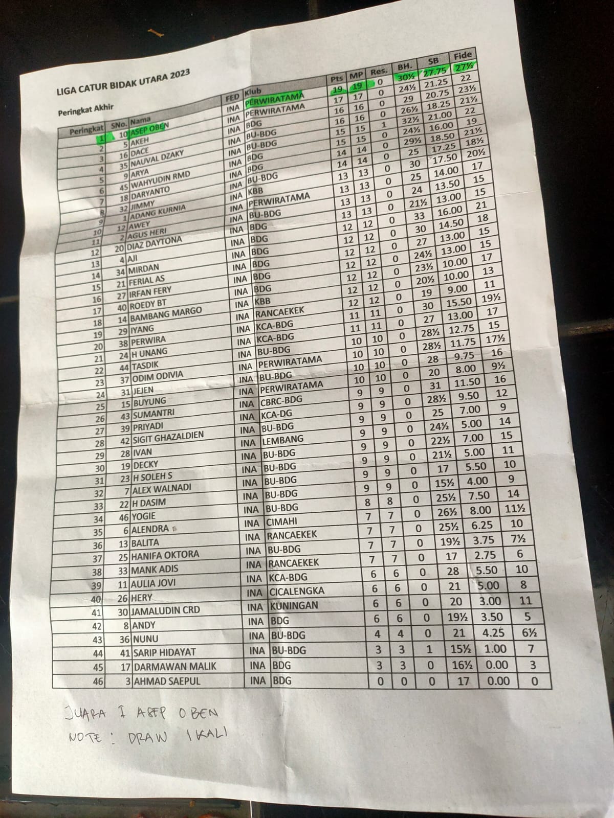 Sebenarnya, kemampuan para peserta bisa dibilang (nyaris) merata..Tapi, dengan alasan geus lila tara catur dan ukuran turnamen atawa liga, ada juga yang jeblog perolehan poinnya alias tak sesuai dengan jam terbang yang dimilikinya.